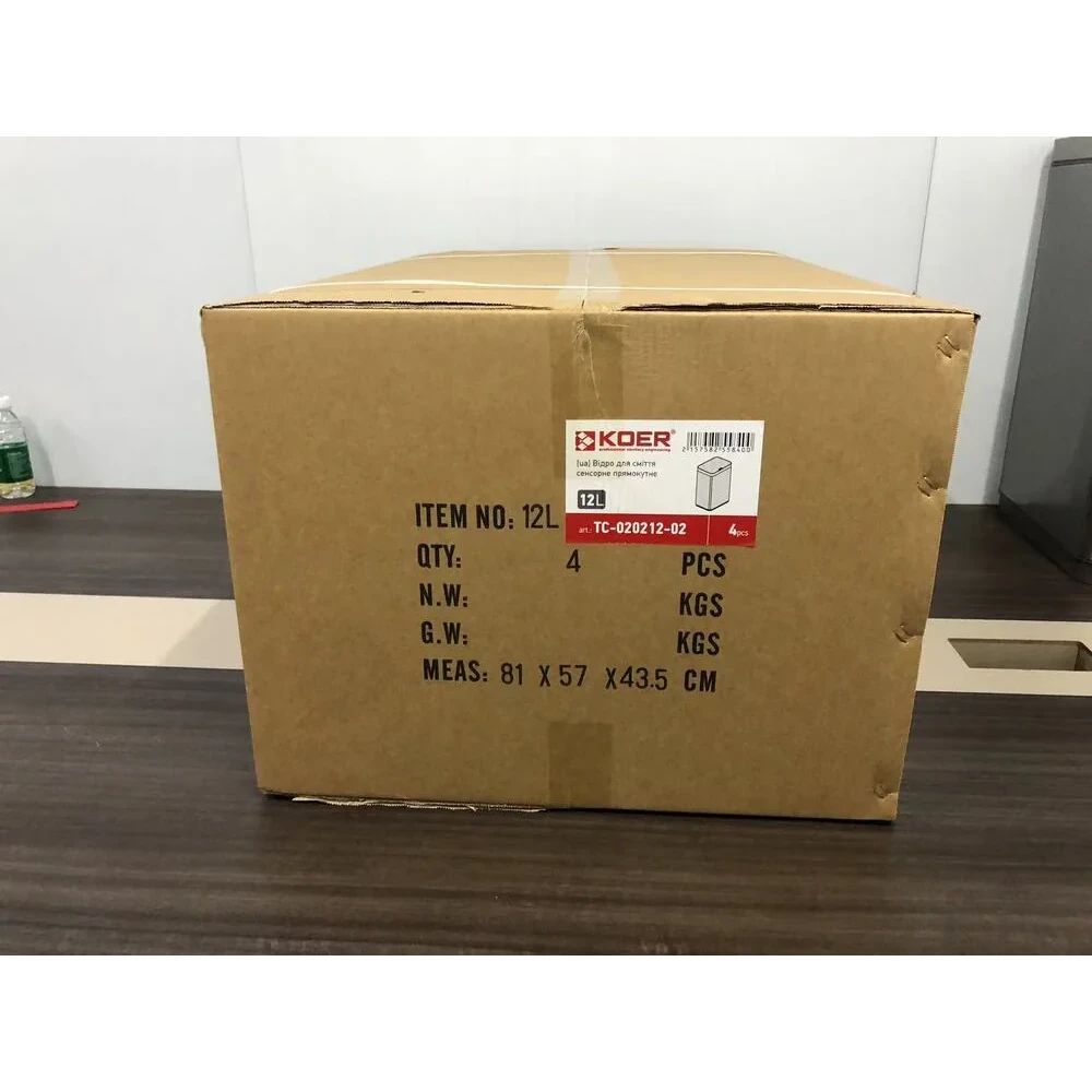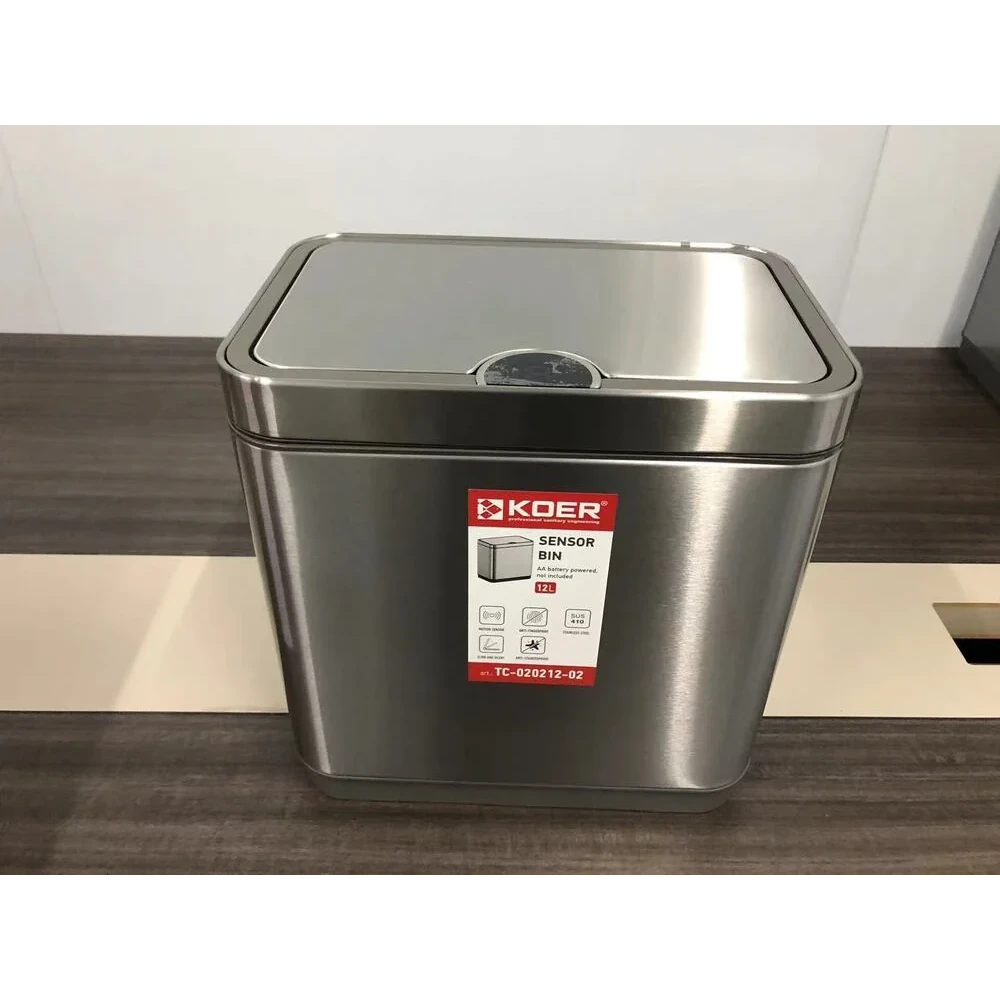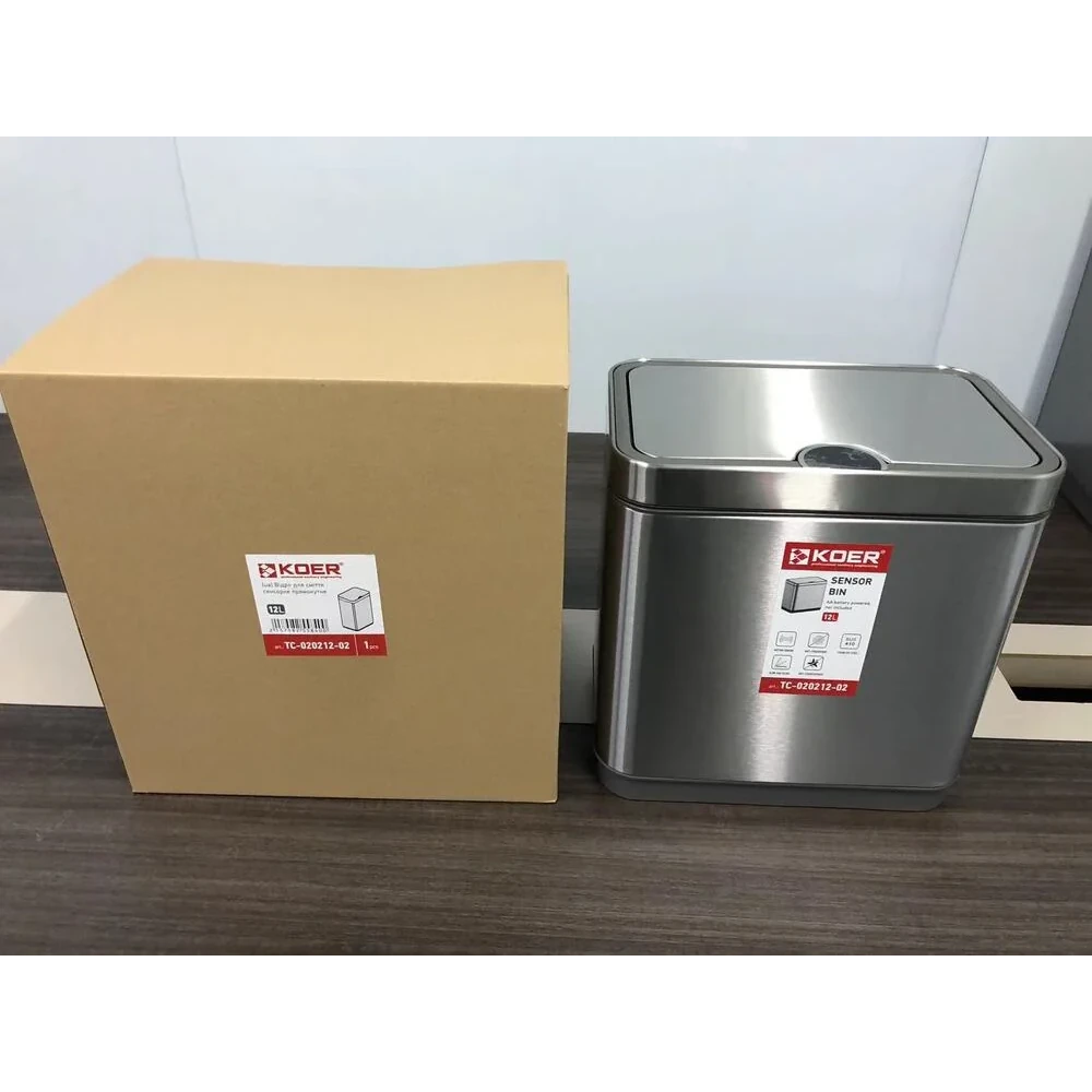 Відро для сміття сенсорне прямокутне KOER модель TC-020212-02 має розмір 350x340x220 мм. Відро для сміття виготовлено з високоякісної нержавіючої сталі. Об'єм виробу становить 12 л. Поверхня відра оброблена за спеціальною технологією, що захищає від відбитків пальців та забруднень. Кришка відра відкривається та закривається плавно та без шуму. Для керування перемикачем кришки у цьому приладі використовується інфрачервоний датчик руху. Кришка відкриється, коли руки або предмети потраплять в зону індукції; кришка буде залишатися відкритою, доки руки або предмети залишаються в зоні індукції; кришка закриється протягом кількох секунд після того, коли руки або предмети залишать зону індукції.
