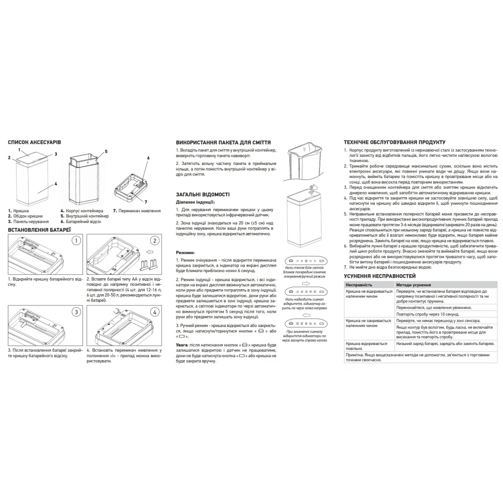 Матеріал комплектуючихНержавіюча сталь SUS410 0,3 мм. Кришка – ABS-пластик. Внутрішнє відро – ПП (поліпропілен). Плата PCB.