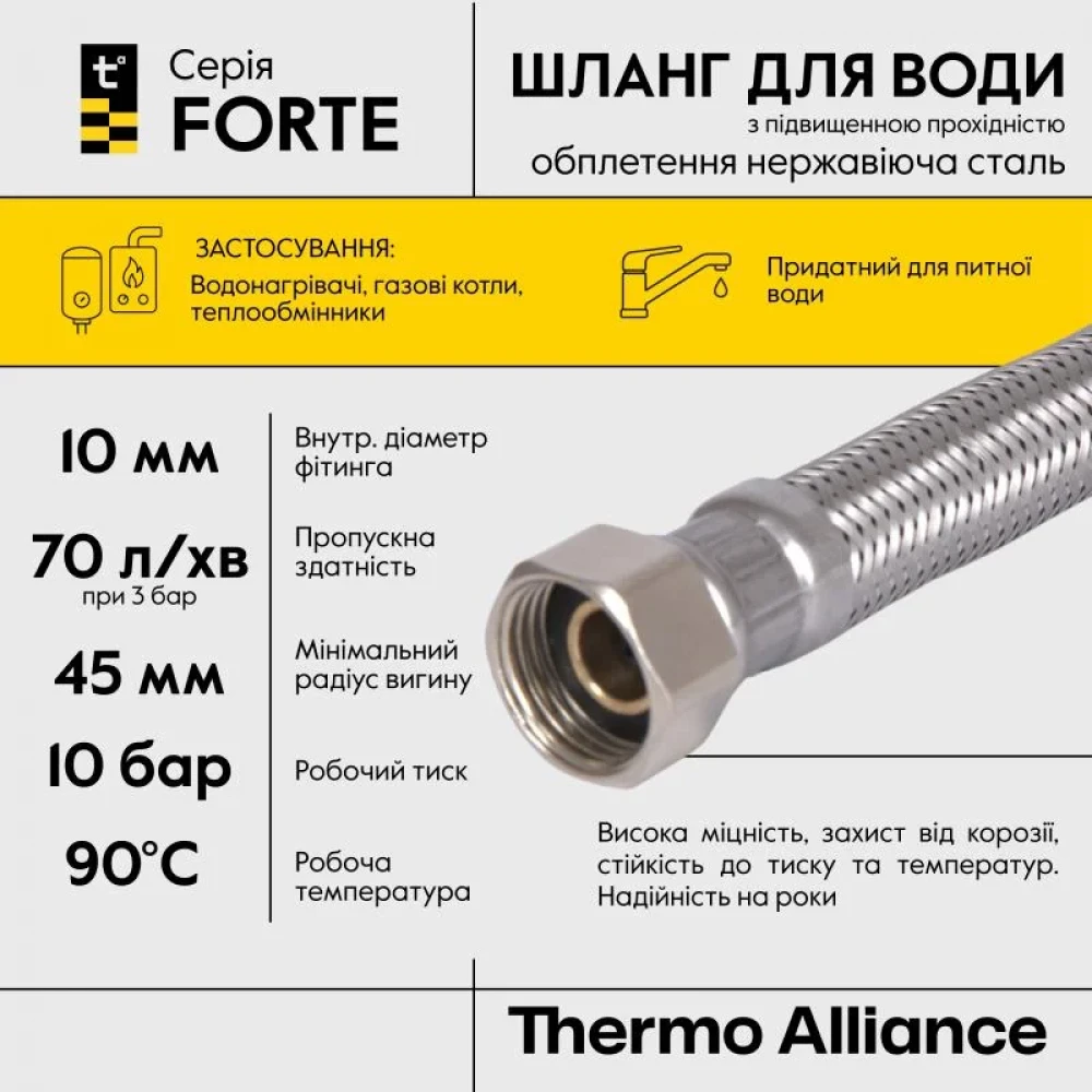 Гнучка підводка Thermo Alliance Forte 1/2x1/2 нержавіюче обплетення, 60 см, D10, ВВ (TAF384W60): короткий опис унікальності