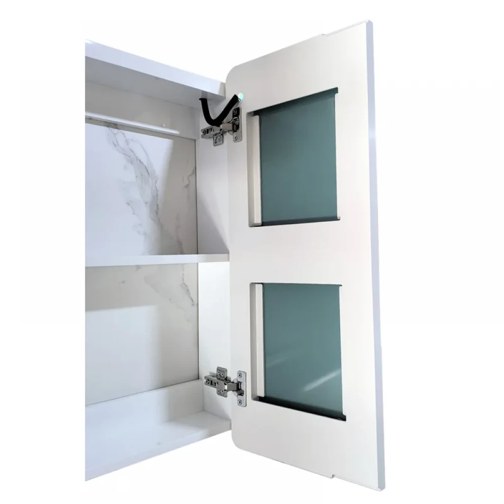 Корпус шкафчика изготовлен из ПВХ, поэтому он полностью влагозащищён. Корпус белого цвета. Фасадная зеркальная часть с 2 дверцами. Внутренняя часть дверец с доской, на которую можно вешать мелкие вещи.