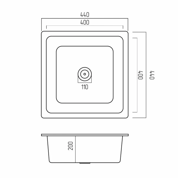 Завдяки своїм компактним розмірам - довжина 440 мм і ширина 440 мм,глибина 200мм- ця мийка ідеально підходить для невеликих кухонь, де кожен дюйм простору цінний. Квадратна форма додає сучасності та гармонію у дизайні.Розмір чаші 400х400х200мм.