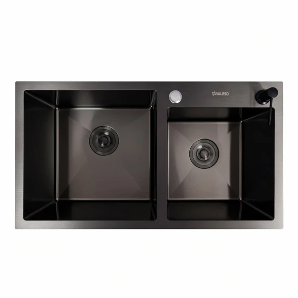 Кухонна мийка 78*43 PVD чорна на дві чаші VALESO Handmade (3.0/0.8) це відмінне стильне рішення для кухні. Лаконічний дизайн прямокутної форми з двома чашами добре пасує різним інтер’єрам кухні та робить мийку функціональною.