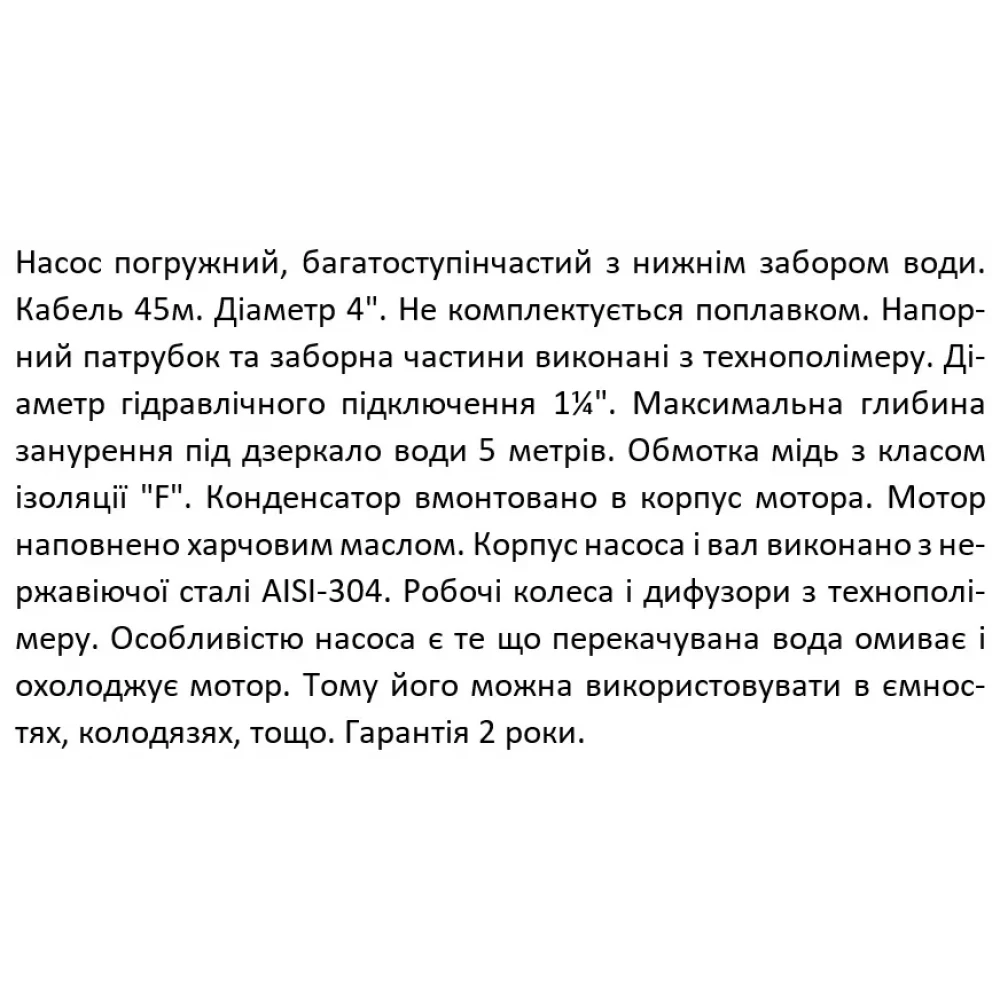 Скважинный насос SHIMGE 4NKm3/7-0.75 предназначен для работы в скважинах диаметром 4 дюйма (96 мм). Модель оснащена двигателем мощностью 0.75 кВт, что обеспечивает отличную производительность: максимальный расход воды достигает 80 литров в минуту, а максимальный напор – 52 метра. Особенностью данного насоса является нижний забор воды, который позволяет эффективно поднимать воду даже из скважин с высоким содержанием песка и ила, минимизируя риск засорения. Длинный кабель питания (45 метров) обеспечивает гибкость при монтаже и позволяет устанавливать насос на значительной глубине.
