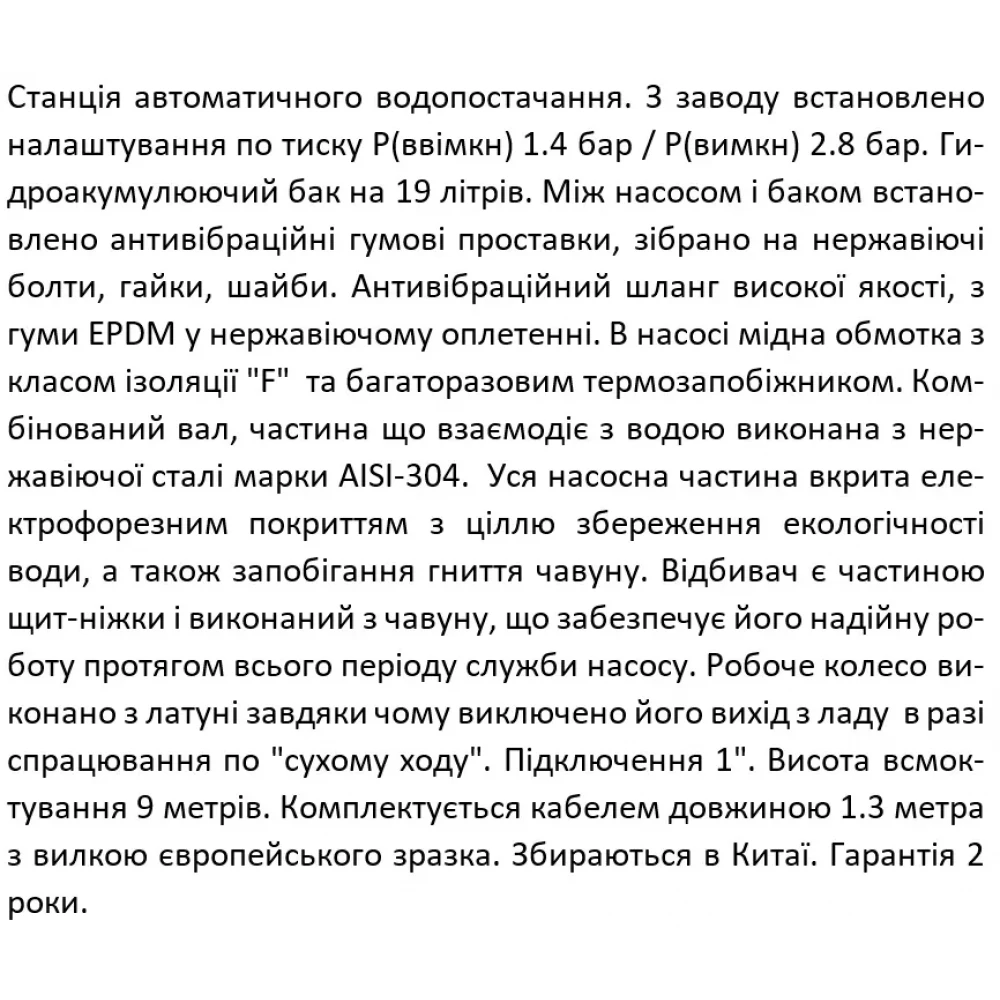 Встроенный гидроаккумулятор объемом 19 литров поддерживает стабильное давление в системе водоснабжения, минимизируя количество включений и выключений насоса. Это продлевает срок службы устройства и обеспечивает равномерную подачу воды в любое время.