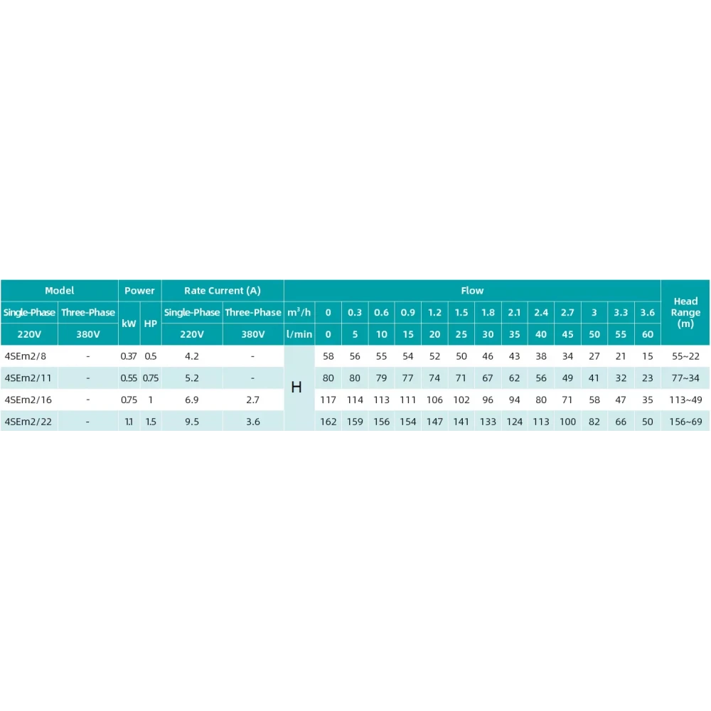 Скважинный насос SHIMGE 4SЕm 2/16T-0.75 предназначен для подъема воды из скважин диаметром от 96 мм. Он оснащен двигателем мощностью 0.75 кВт и поставляется с кабелем длиной 45 метров, что значительно упрощает монтаж и подключение. Насос способен обеспечить напор до 117 метров (или 80 метров при максимальной производительности) и производительность до 60 литров в минуту (или 40 литров в минуту при максимальном напоре). Корпус насоса выполнен в белом и сером цветах.