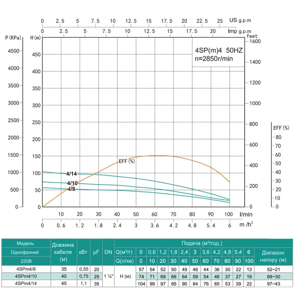 Модель 4SP(m) 4/8-0.55 кВт отличается высокой эффективностью и способна обеспечить напор до 57 метров (максимальный напор 44 метра) и производительность до 100 литров в минуту (максимальная производительность 60 литров в минуту). Компактный диаметр насоса, составляющий всего 96 мм, позволяет устанавливать его в скважины с небольшим диаметром обсадной трубы, что делает его универсальным решением для различных типов скважин.