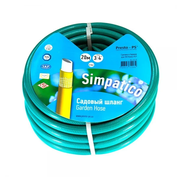 Шланг для полива Presto-PS Simpatico (BLLS 3/4 20) диаметром 19 мм (3/4") длиной 20 метров изготовлен из качественного ПВХ, стойкого к воздействию воды и различных видов водорастворимых удобрений. Наружный прозрачный слой защищает шланг от физических повреждений, стирания и ультрафиолетового излучения. Средний слой усилен армирующей оплеткой с сетчатым плетением из прочного синтетического волокна, он защищает шланг от разрывов и делает его устойчивым к давлению до 6 атмосфер. Внутренний слой гладкий, не создает сопротивления току воды, не содержит вредных примесей свинца, бария и кадмия.