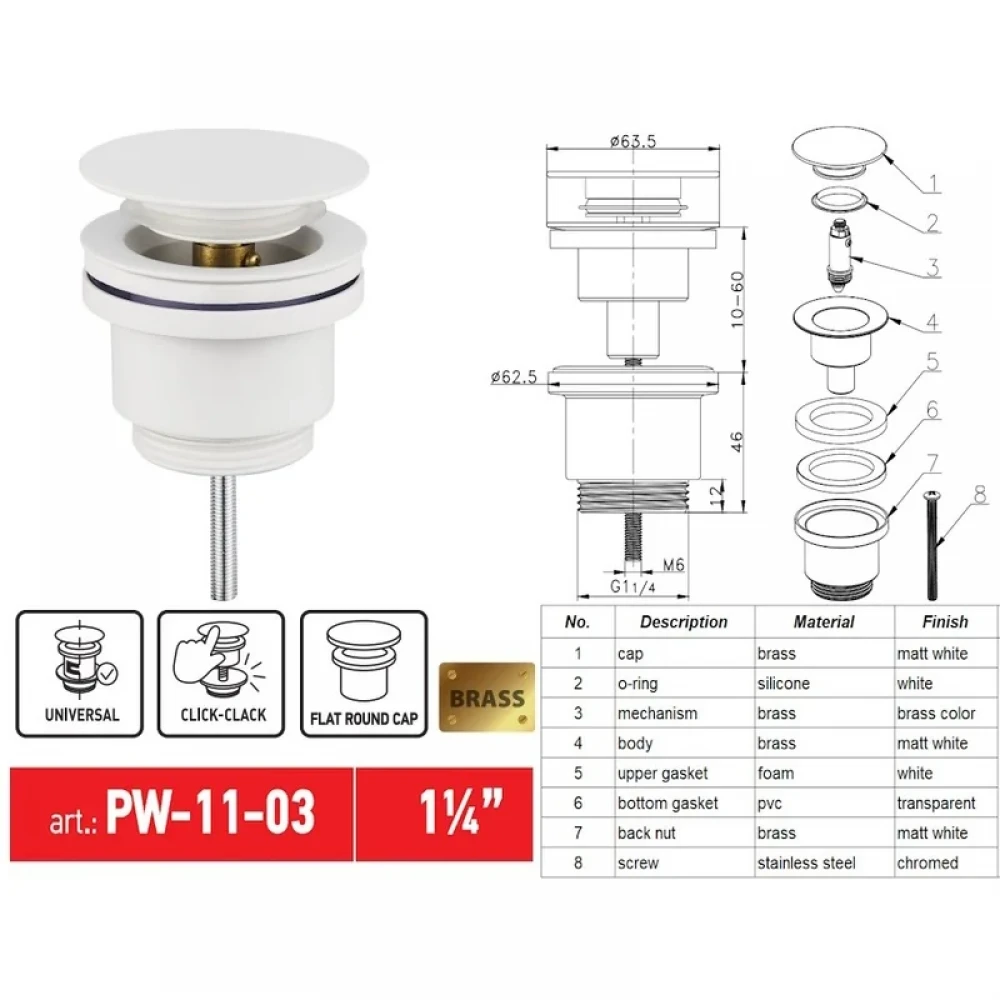 Донний клапан з функцією Click-Clack, універсальний, підходить для умивальників як з переливним отвором, так і без нього. Система Click-Clack працює за принципом простого натискання: одне натискання закриває клапан, блокуючи злив води, а повторне натискання відновлює відтік. Донний клапан виготовлений із високоякісної латуні, тому забезпечує надійну роботу протягом тривалого часу. Автоматичне керування забезпечує легкість у користуванні для набирання й зливу води. Виріб дозволяє перекрити злив у разі потреби та використовувати раковину як таз. Діаметр підключення: 1 1/4''. Універсальне з’єднання зі стандартним кроком різьби підходить до будь-якого сифона. Дизайн – відповідає останнім тенденціям, виглядає дуже елегантно та чудово вписується у сучасну ванну кімнату. Донний клапан для раковини оснащений кришкою білого кольору, що дозволяє поєднувати його з раковинами білого кольору.