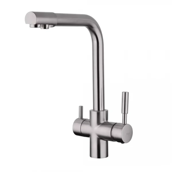 Смеситель FRAP F4352-5 выполнен в стильном сатиновом покрытии, которое не только придает ему элегантный внешний вид, но и обеспечивает устойчивость к царапинам и другим повреждениям. Корпус из высококачественной латуни гарантирует долговечность и надежность в эксплуатации. Особенностью данной модели является наличие двух отдельных изливов – для горячей и холодной воды, что позволяет удобно использовать его для различных кухонных задач.