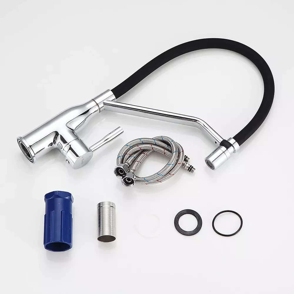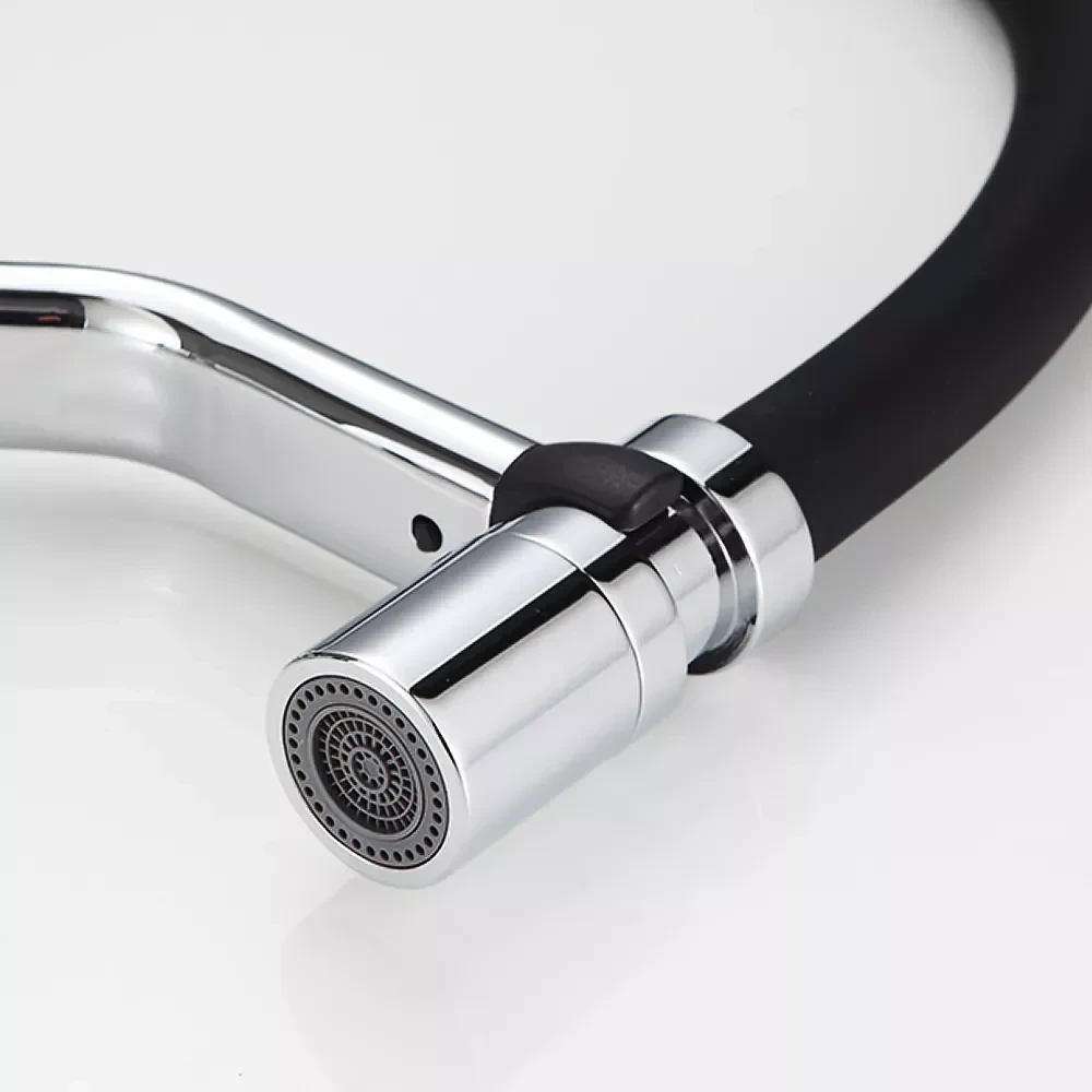 Корпус смесителя изготовлен из высококачественной латуни, обеспечивая долговечность и устойчивость к коррозии. Хромированное покрытие придает смесителю блестящий и современный вид, который легко впишется в любой интерьер кухни. Гибкий силиконовый излив позволяет легко направлять струю воды в нужном направлении, облегчая процесс мытья больших предметов и наполнения высоких емкостей. Удобное однорычажное управление позволяет легко регулировать температуру и напор воды одной рукой, обеспечивая максимальный комфорт при использовании.