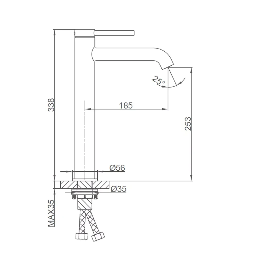- Установите смеситель на раковину, закрепив его с помощью гайки Ø35.