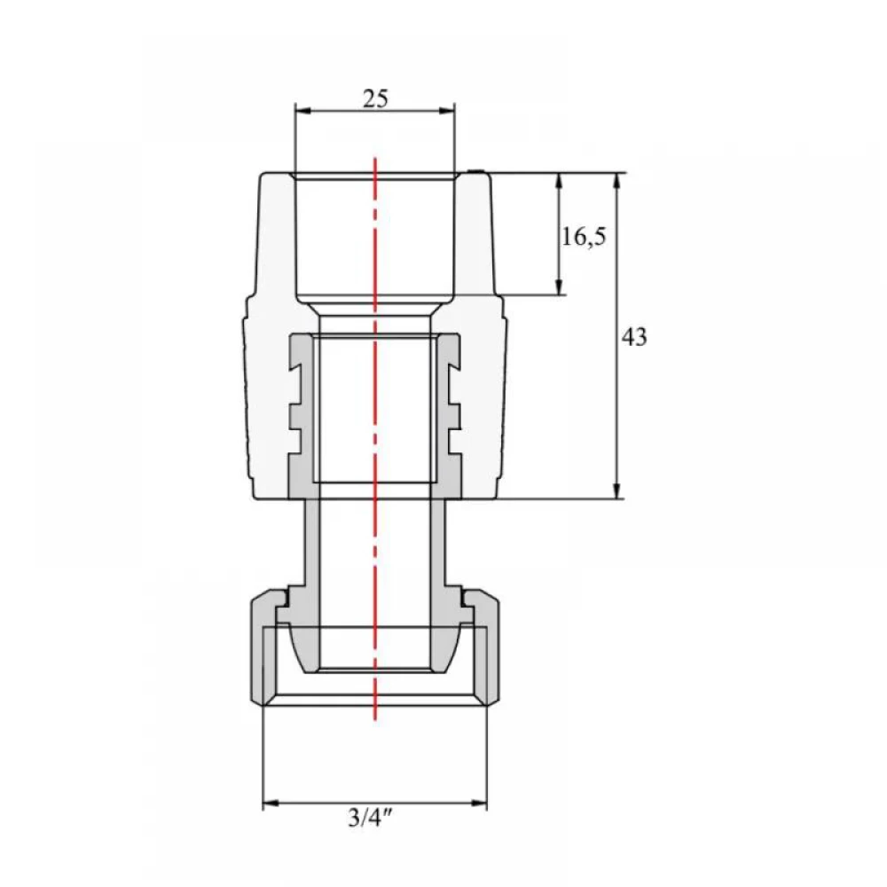 - Приєднайте накидну гайку до елемента з зовнішньою різьбою 3/4" ВР та затягніть її ключем. Не перетягуйте гайку, щоб не пошкодити ущільнювальне кільце.