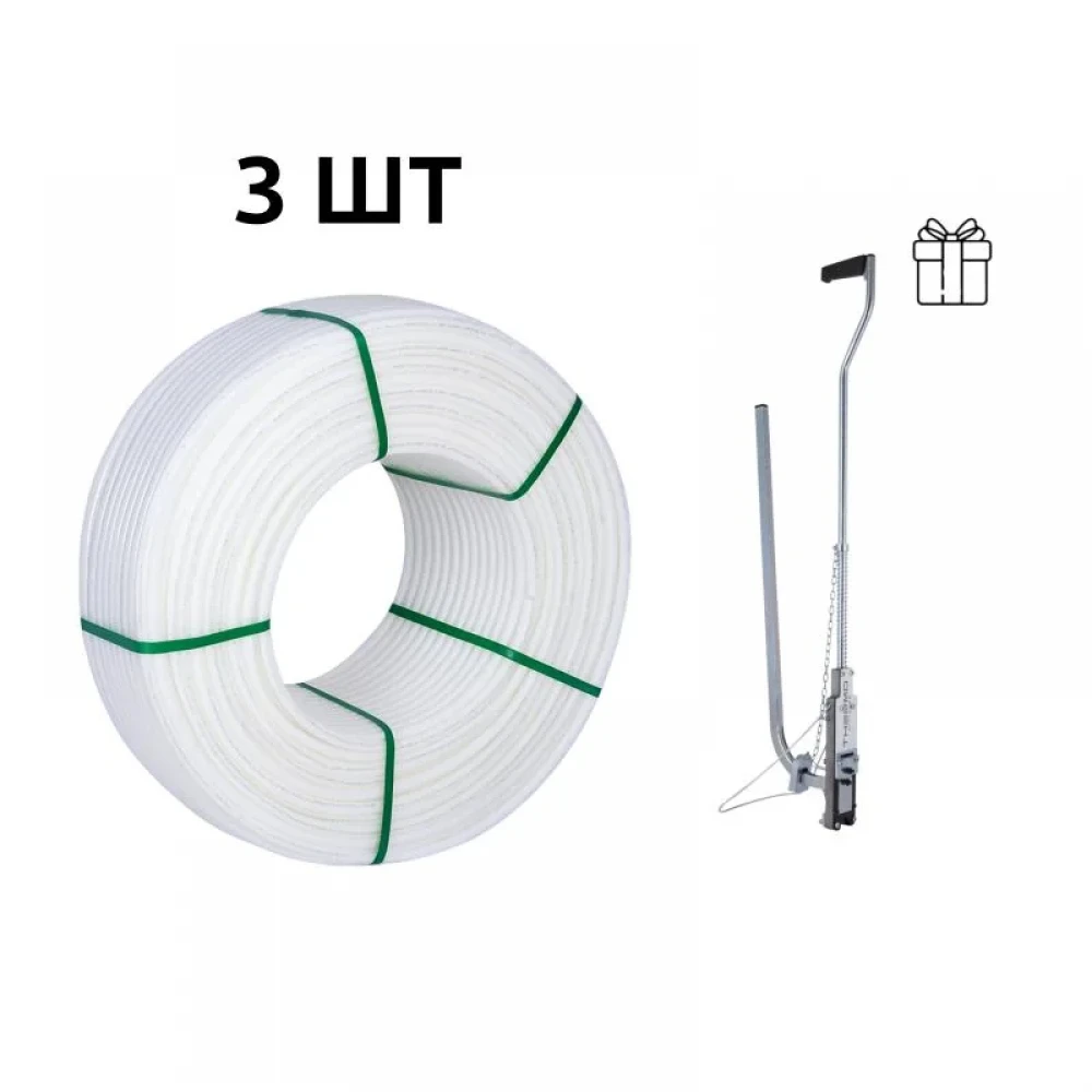 Набір для швидкого і якісного монтажу теплої підлоги. У комплект входять 3 бухти високоякісної труби PEX-A EVOH WHITE, 5 шарів, 16×2,0 мм, загальною довжиною 320 м, виробництва Іспанія. Труба має захисний шар EVOH від кисневої дифузії, відзначається міцністю і довговічністю. У подарунок додається такер ТК-100, який значно спрощує кріплення труби до утеплювача.