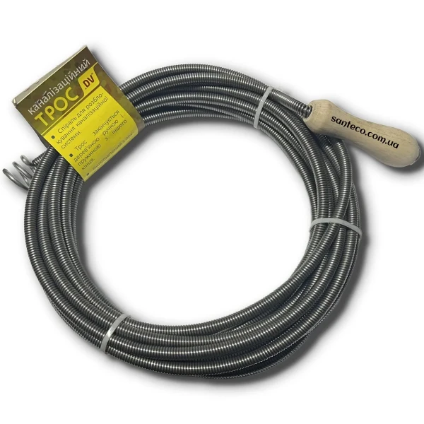 Трос для прочистки канализации диаметром 9мм, что обеспечивает достаточно жесткость для прочистки трубы, а с деревянная ручка обеспечит удобство вращения. Трос изготовлен из пружинной стали и заканчивается он спиралью