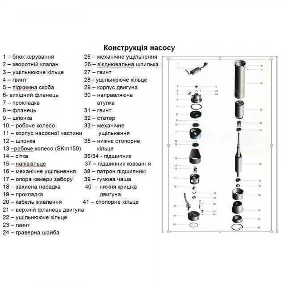 Насос 4SKm складається з однофазного електродвигуна з масляним охолодженням, призначеного для роботи під водою, і насосної частини з робочим колесом вихрового типу.