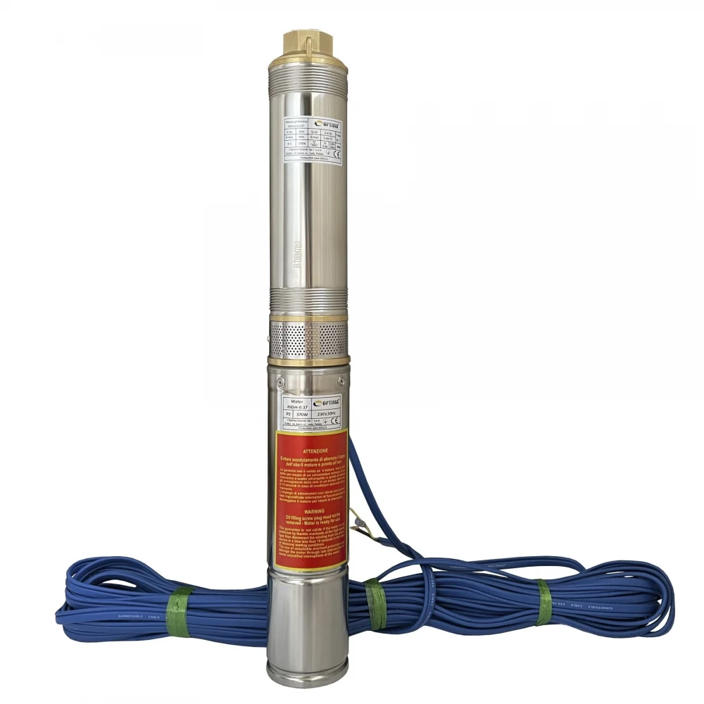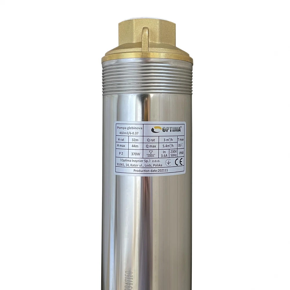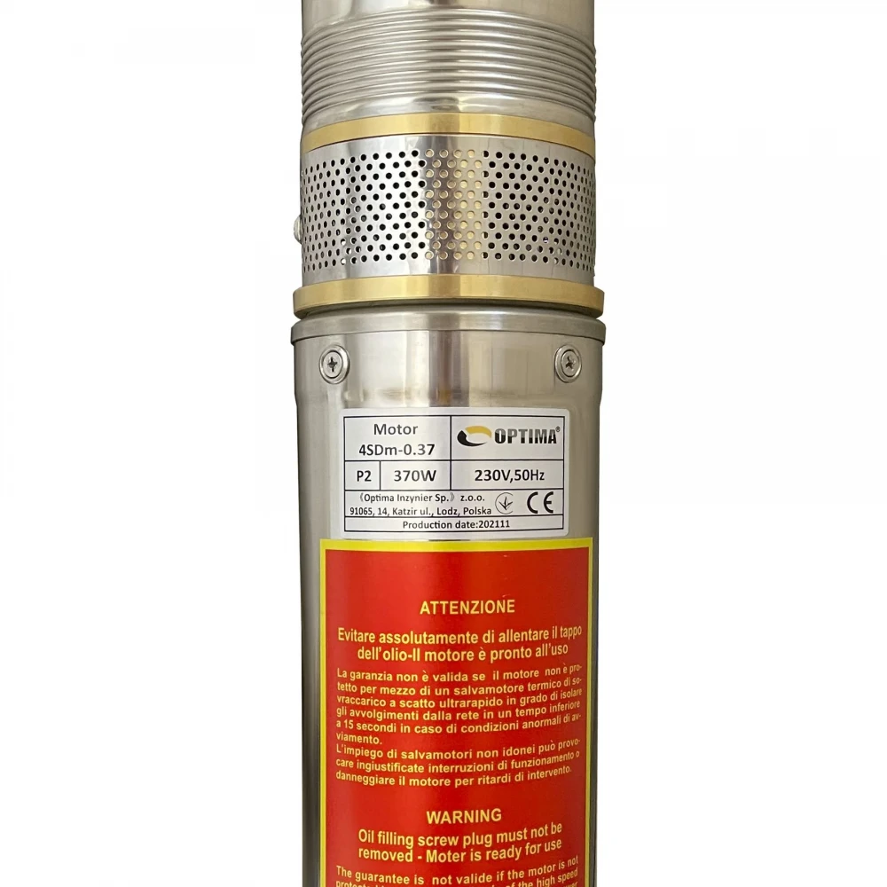 Насос OPTIMA 4SDm3 / 6 0.37 кВт 44м оснащений асинхронним однофазними двигуном з коротко замкнутим ротором і «плаваючим» робочим колесом, для реалізації підвищеної стійкості до піску. Насос комплектується вбудованим в пульт теплової захистом, а також конденсаторним блоком. Двигун заповнений спеціальним мінеральним маслом для ефективного охолодження (тепловіддачі в навколишнє середовище), а також для змащення й охолодження підшипників і механічного ущільнення.