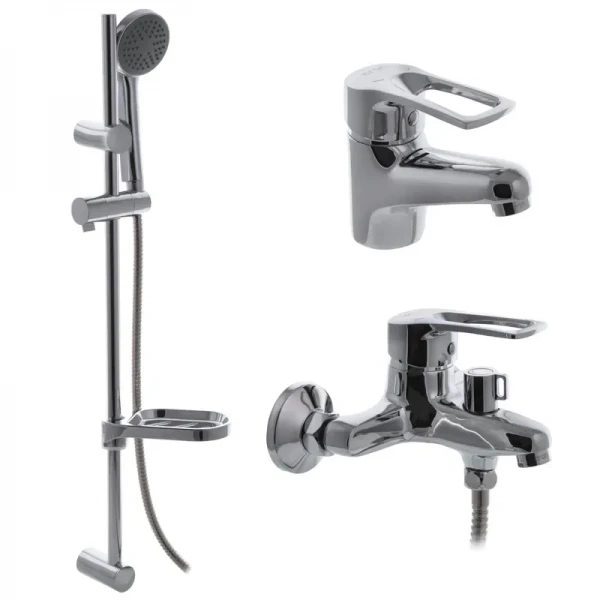 - Комплексне рішення для ванної кімнати: змішувач для ванни з душем та змішувач для раковини.