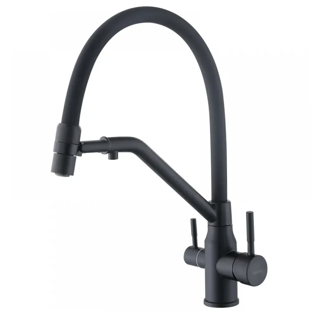 Цей врізний змішувач призначений для встановлення на кухонну мийку або стільницю. Завдяки високому гнучкому виливу він підходить для мийок будь-якої глибини. Основна функція моделі — можливість одночасного підключення до водопроводу та системи фільтрації питної води. Два окремі канали всередині конструкції запобігають змішуванню водопровідної та очищеної води, що дозволяє отримувати питну воду безпосередньо з крана, не встановлюючи додаткове обладнання.