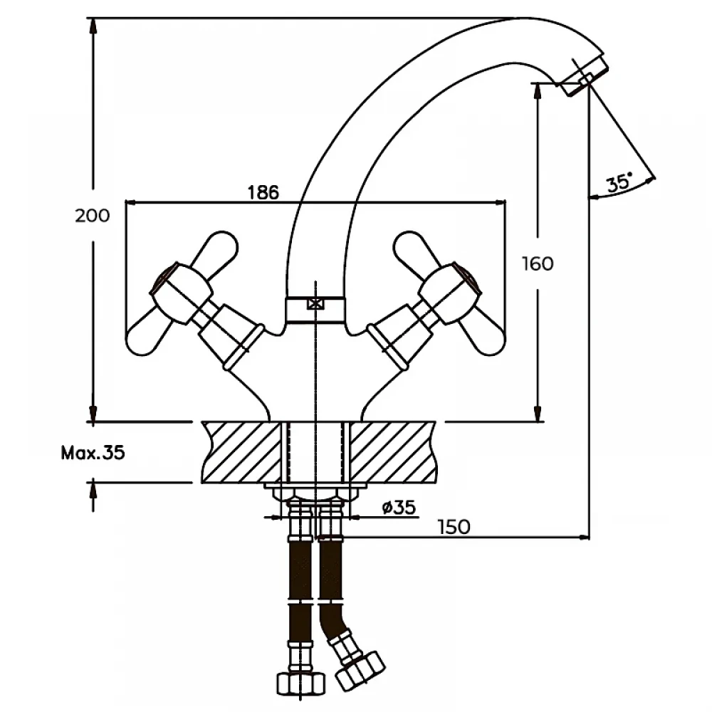 - Встановіть змішувач на умивальник, пропустивши гнучкі підводи через отвір.